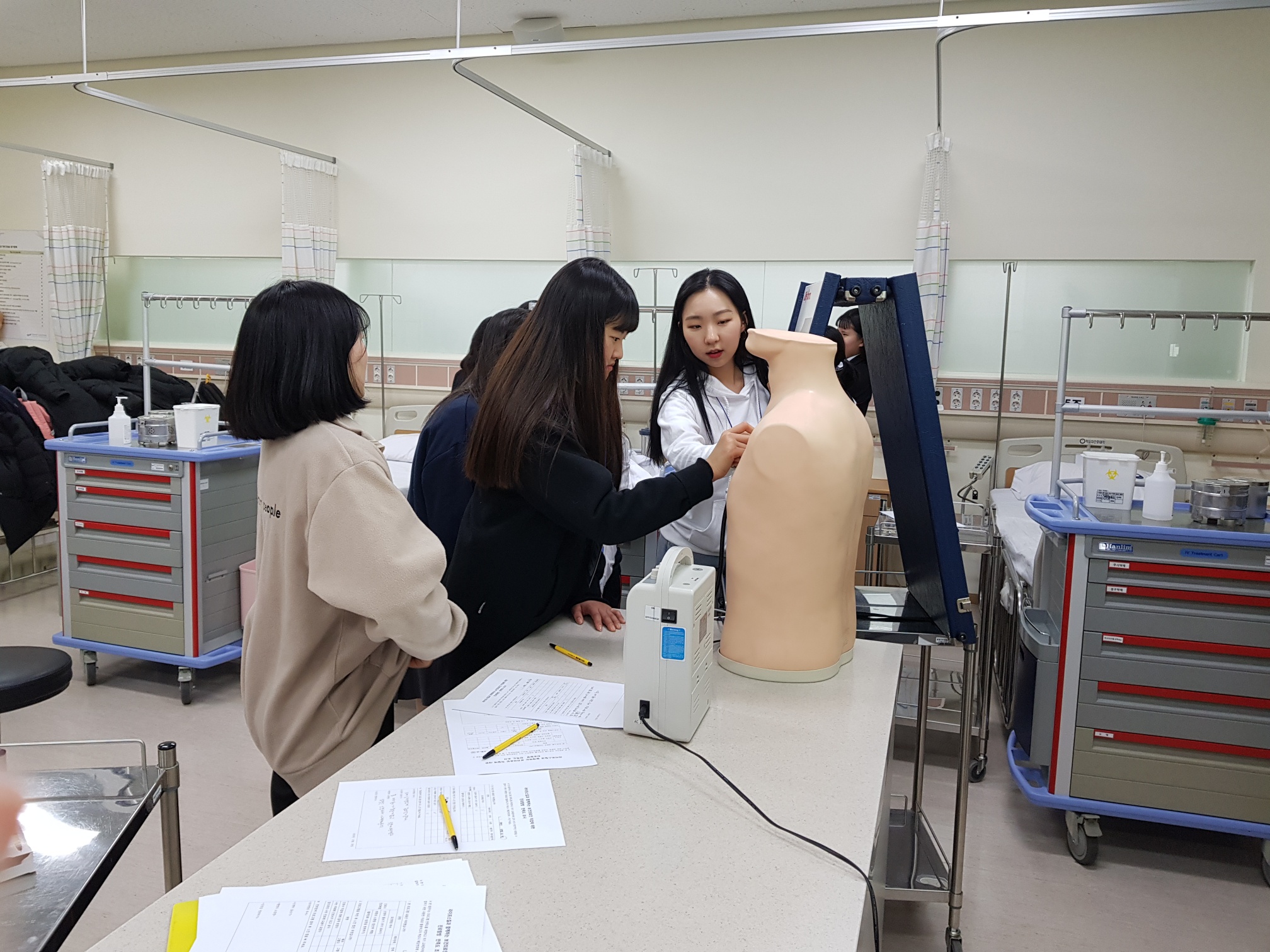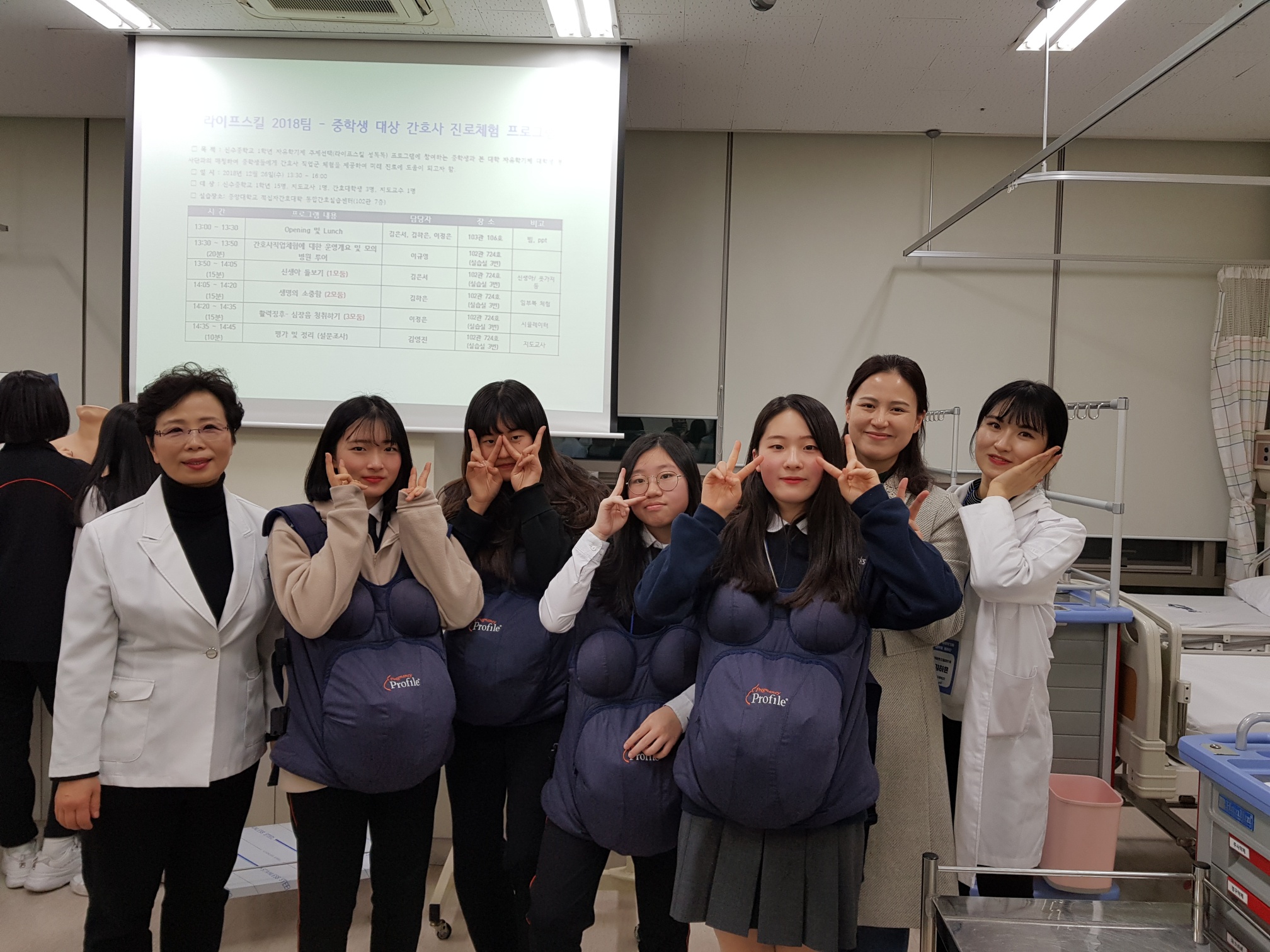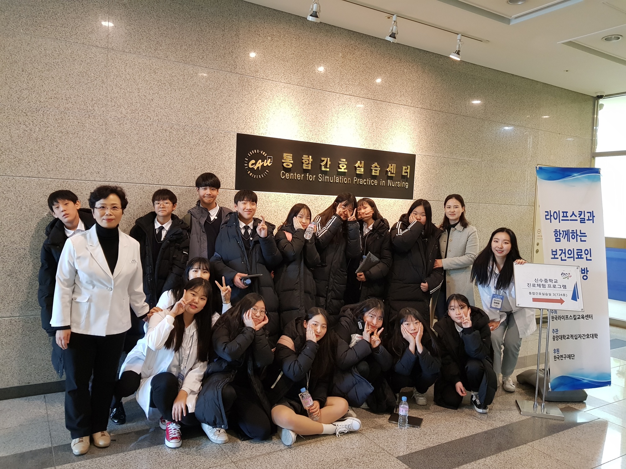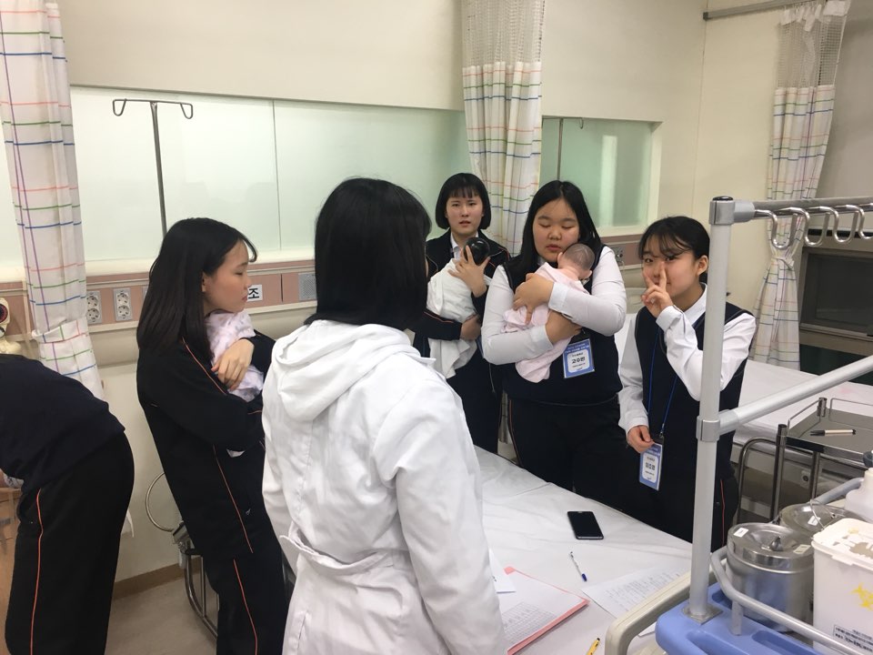 제목 : 라이프스킬과 함께하는 보건의료인 진로탐방 일시 : 2018.12.26.(수) 장소 : 중앙대학교 적십자 간호대학 통합실습실 (102관) 적십자간호대학 통합실습실에서 ‘라이프스킬 성톡톡’ 자유학기제 주제선택에 참여하는 신수중학교 1학년 학생(담당교사: 김영진)을 대상으로 ‘간호사 직업체험’을 실시함.