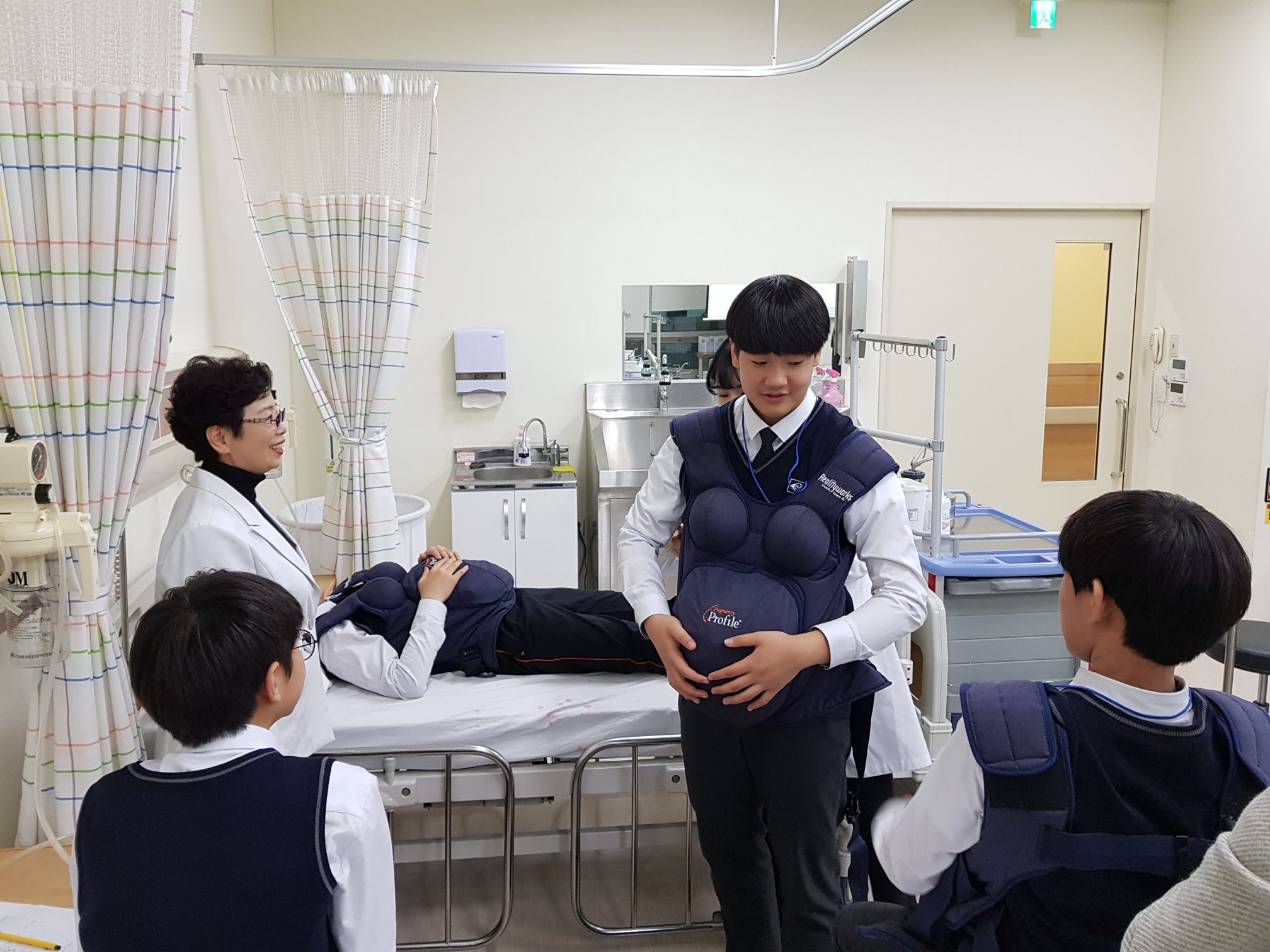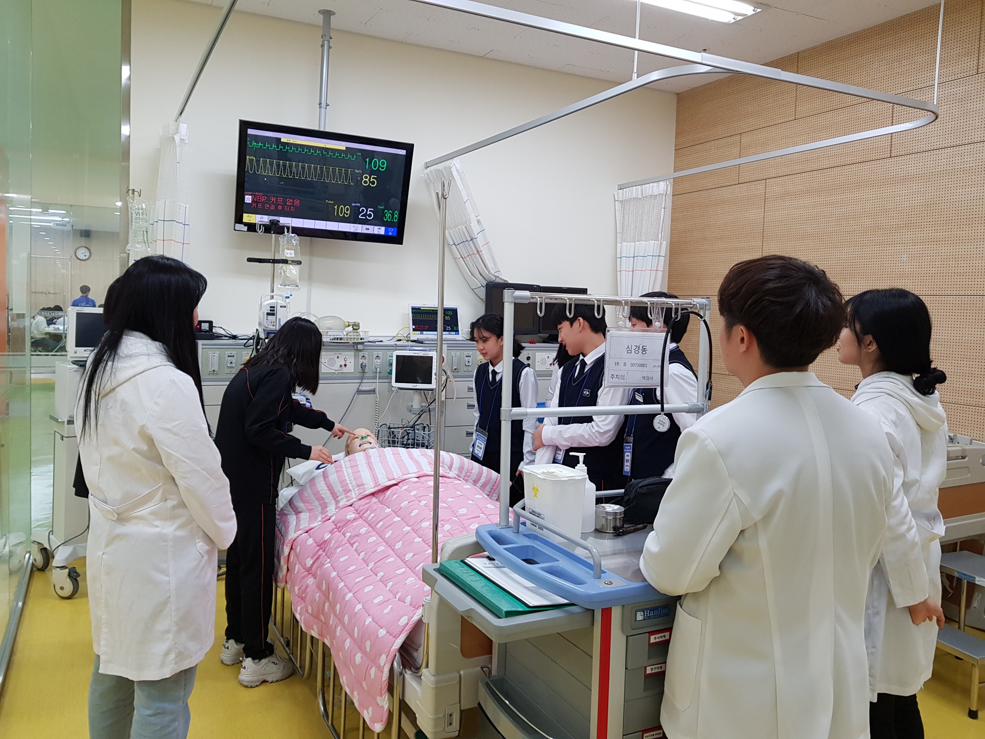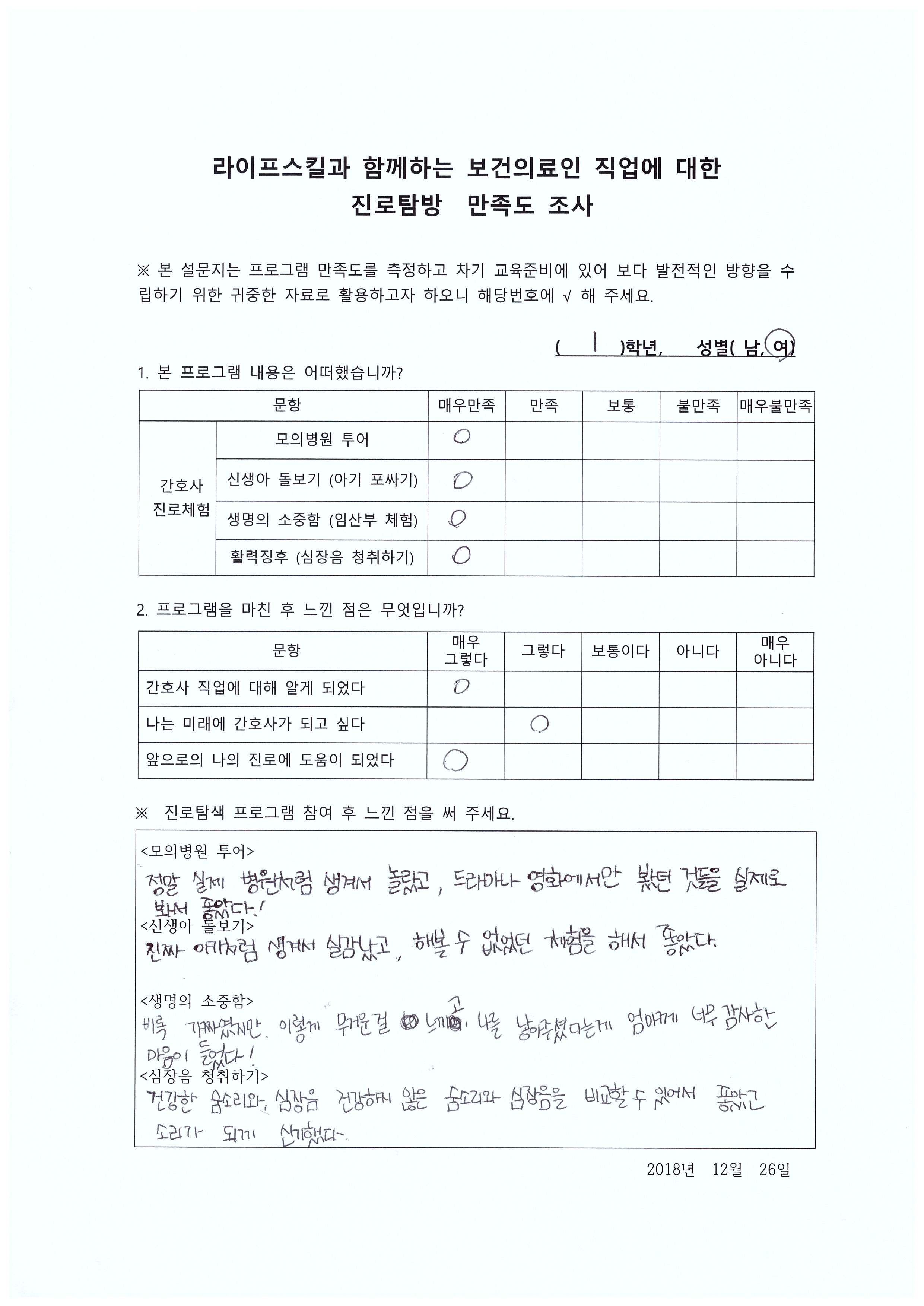 제목 : 라이프스킬과 함께하는 보건의료인 진로탐방 일시 : 2018.12.26.(수) 장소 : 중앙대학교 적십자 간호대학 통합실습실 (102관) 적십자간호대학 통합실습실에서 ‘라이프스킬 성톡톡’ 자유학기제 주제선택에 참여하는 신수중학교 1학년 학생(담당교사: 김영진)을 대상으로 ‘간호사 직업체험’을 실시함.