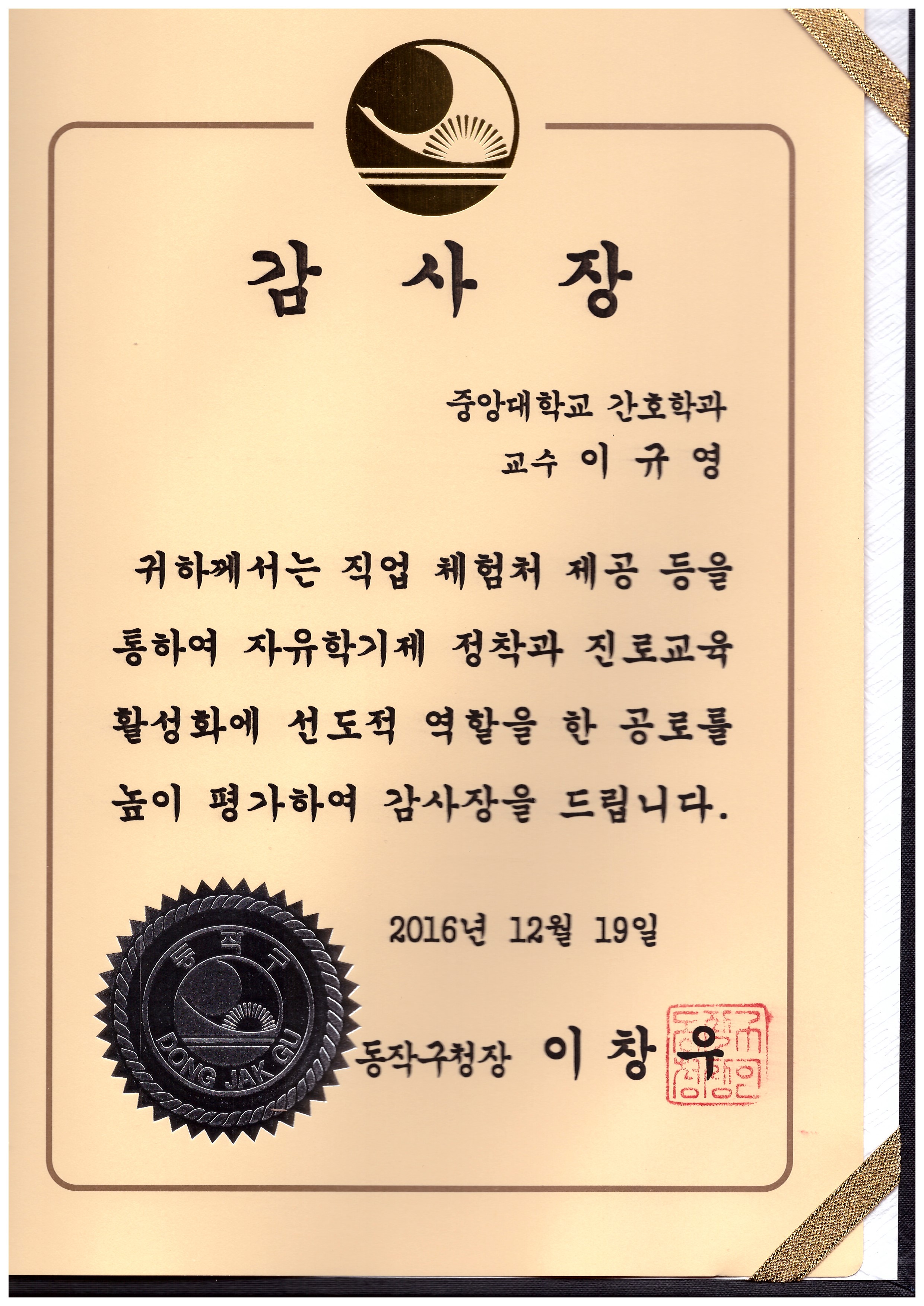 동작구청장 감사장