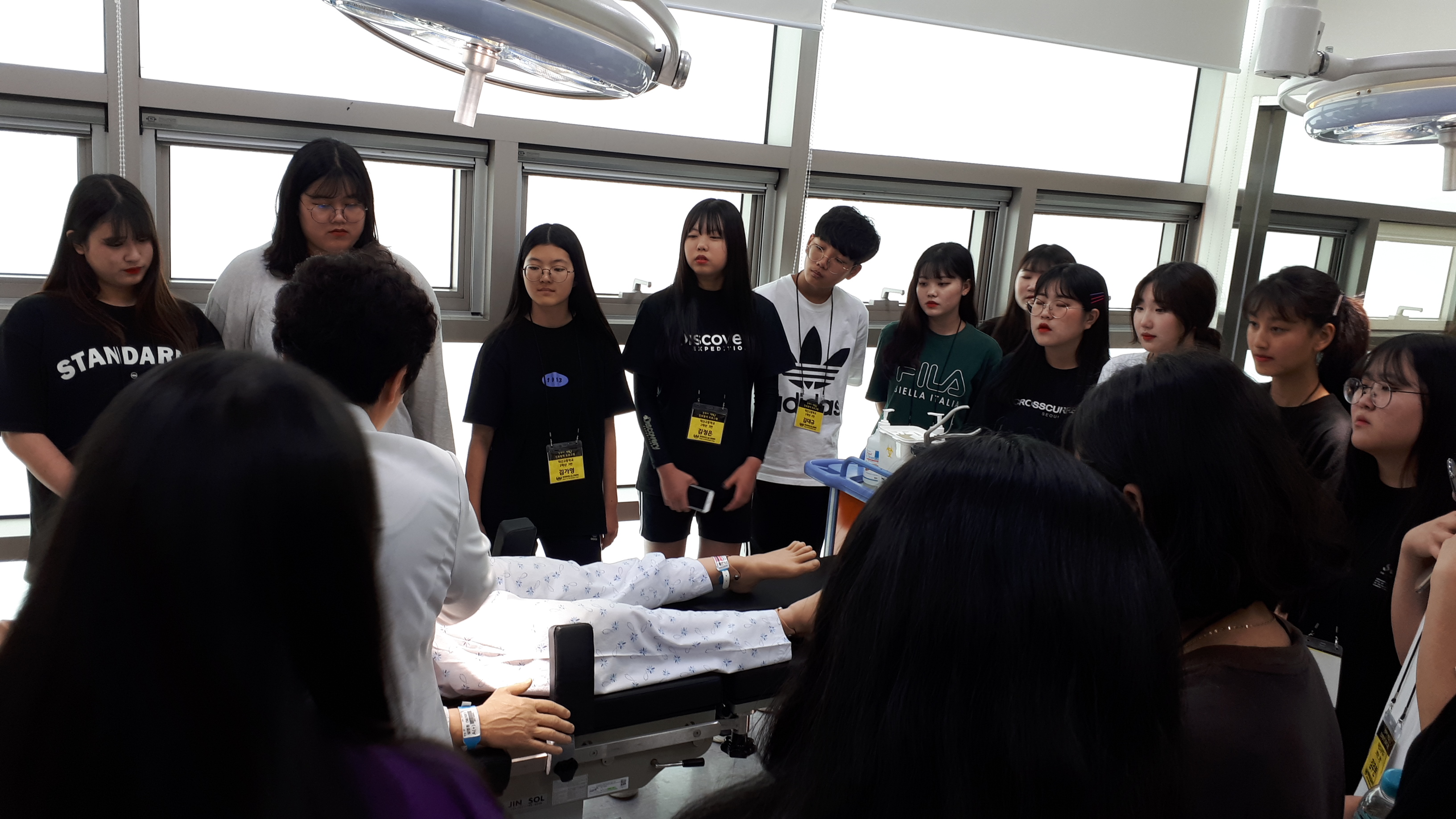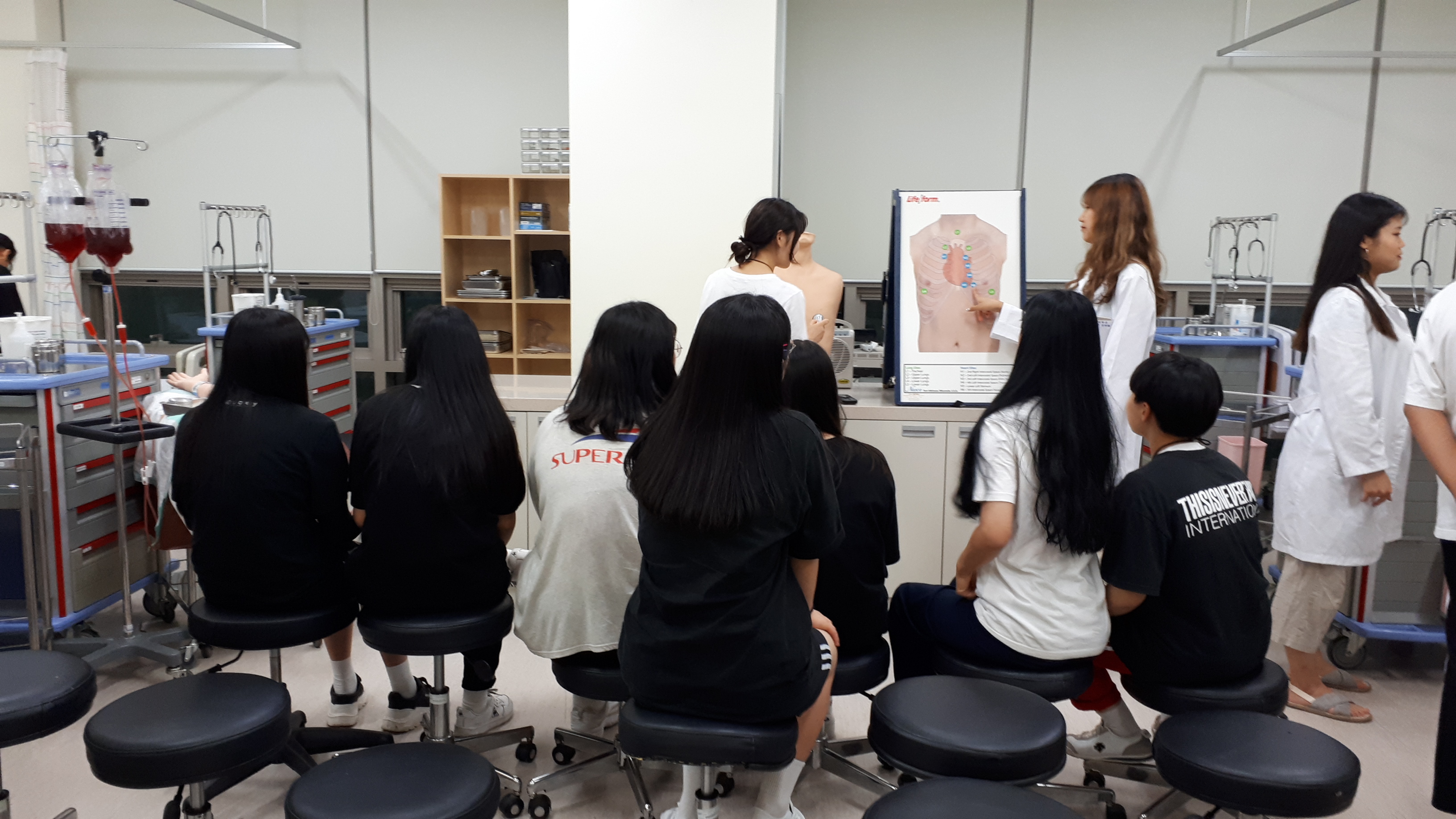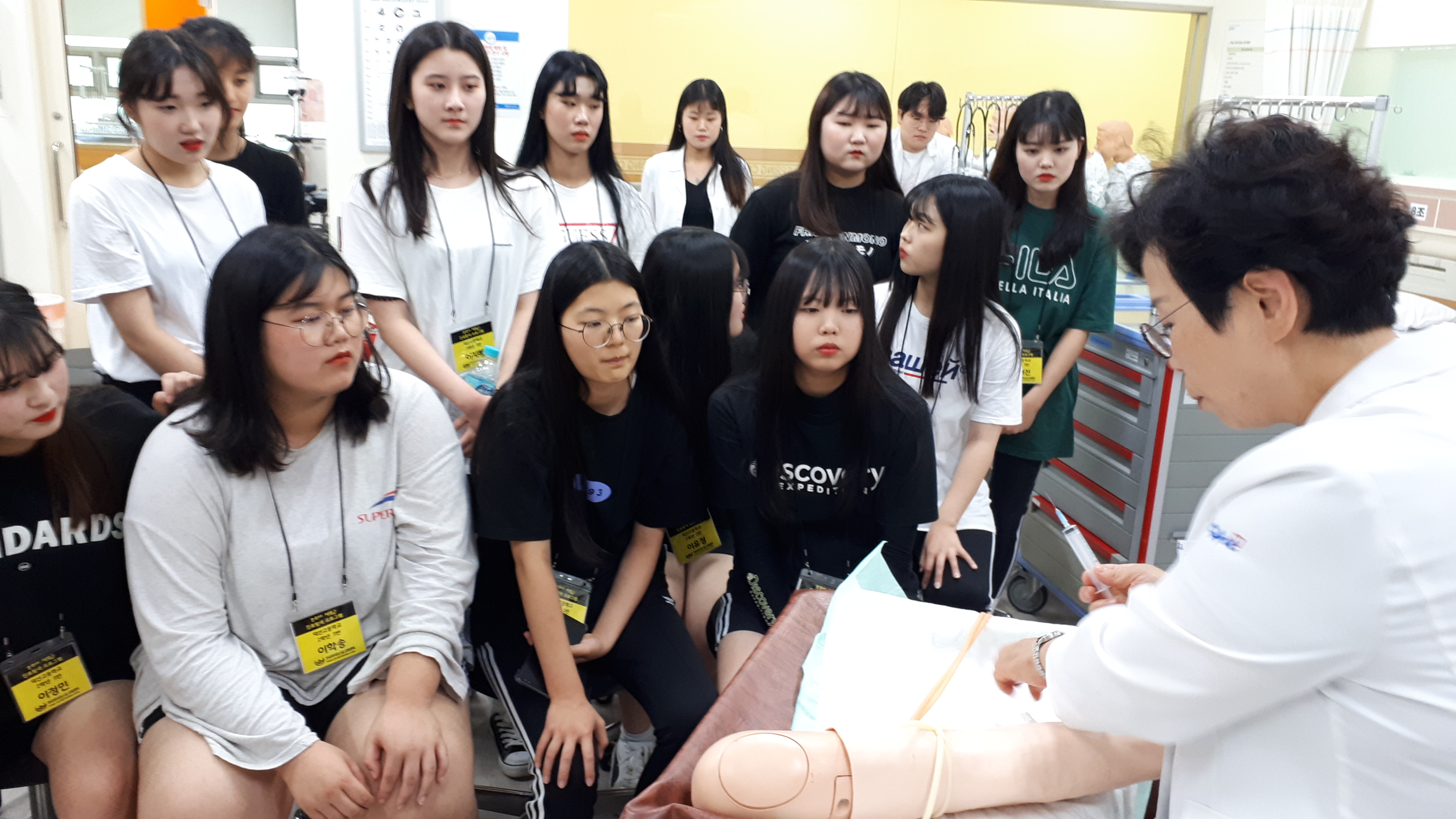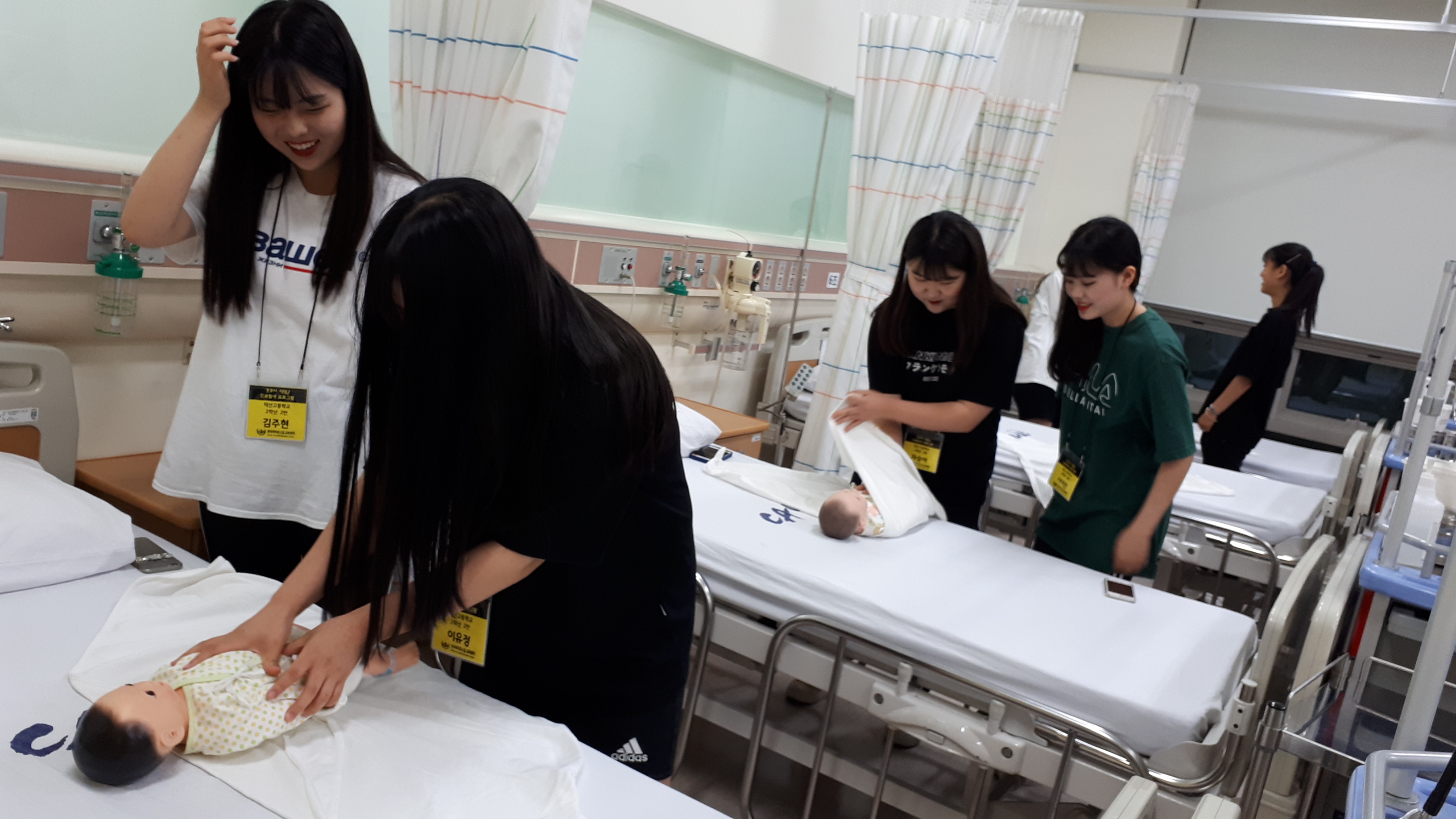 제목 : 라이프스킬과 함께하는 보건의료인 진로탐방 일시 : 2019. 7.15(월) 장소 : 중앙대학교 적십자 간호대학 통합실습실 (102관) 적십자간호대학 통합실습실에서 라이프스킬로 배우는 간호사 체험 프로그램에 참여하는 덕산고등학교 학생 (담당교사:한재영)들을 대상으로 ‘간호사 직업체험’을 실시함