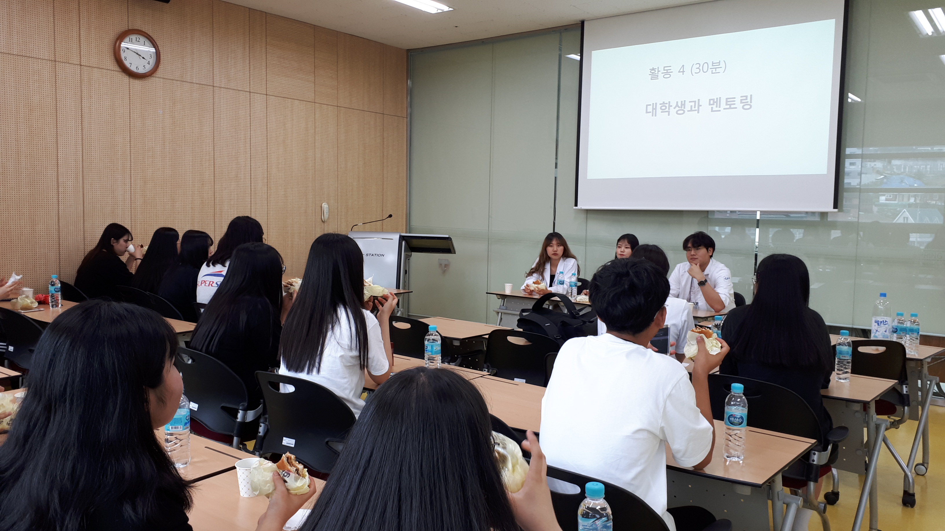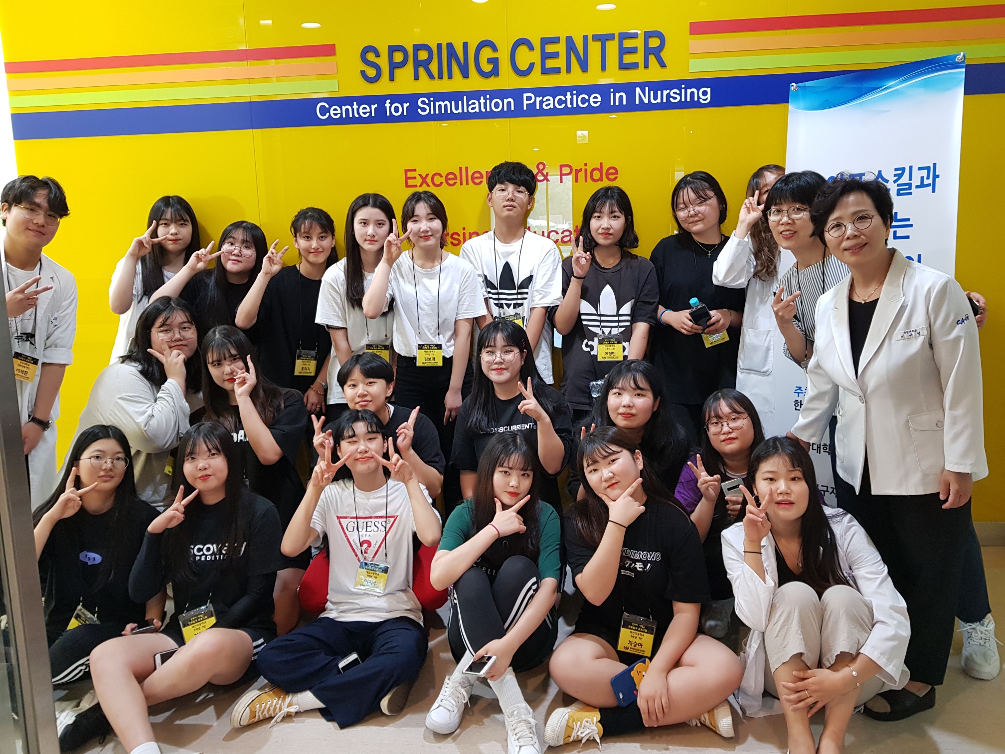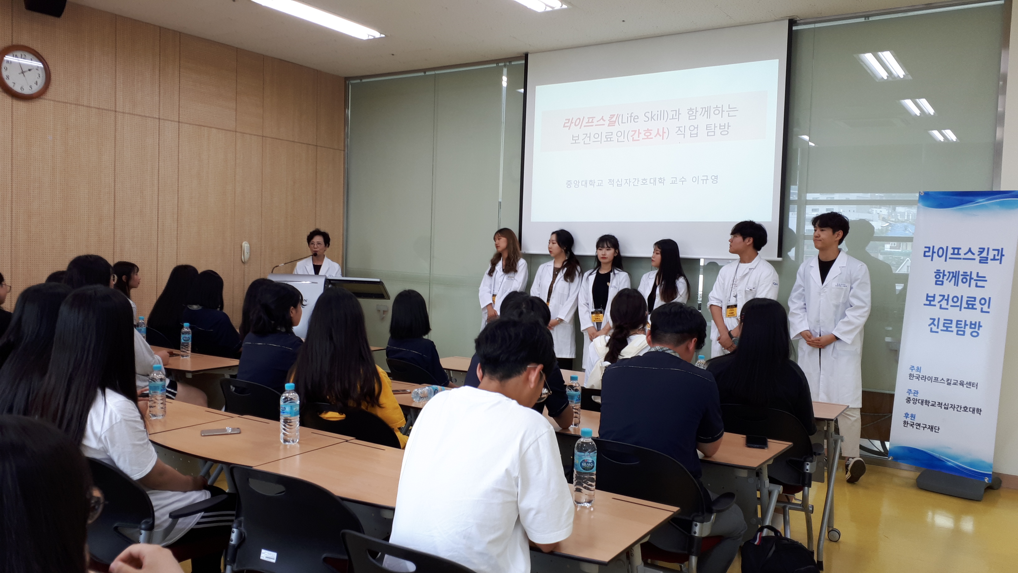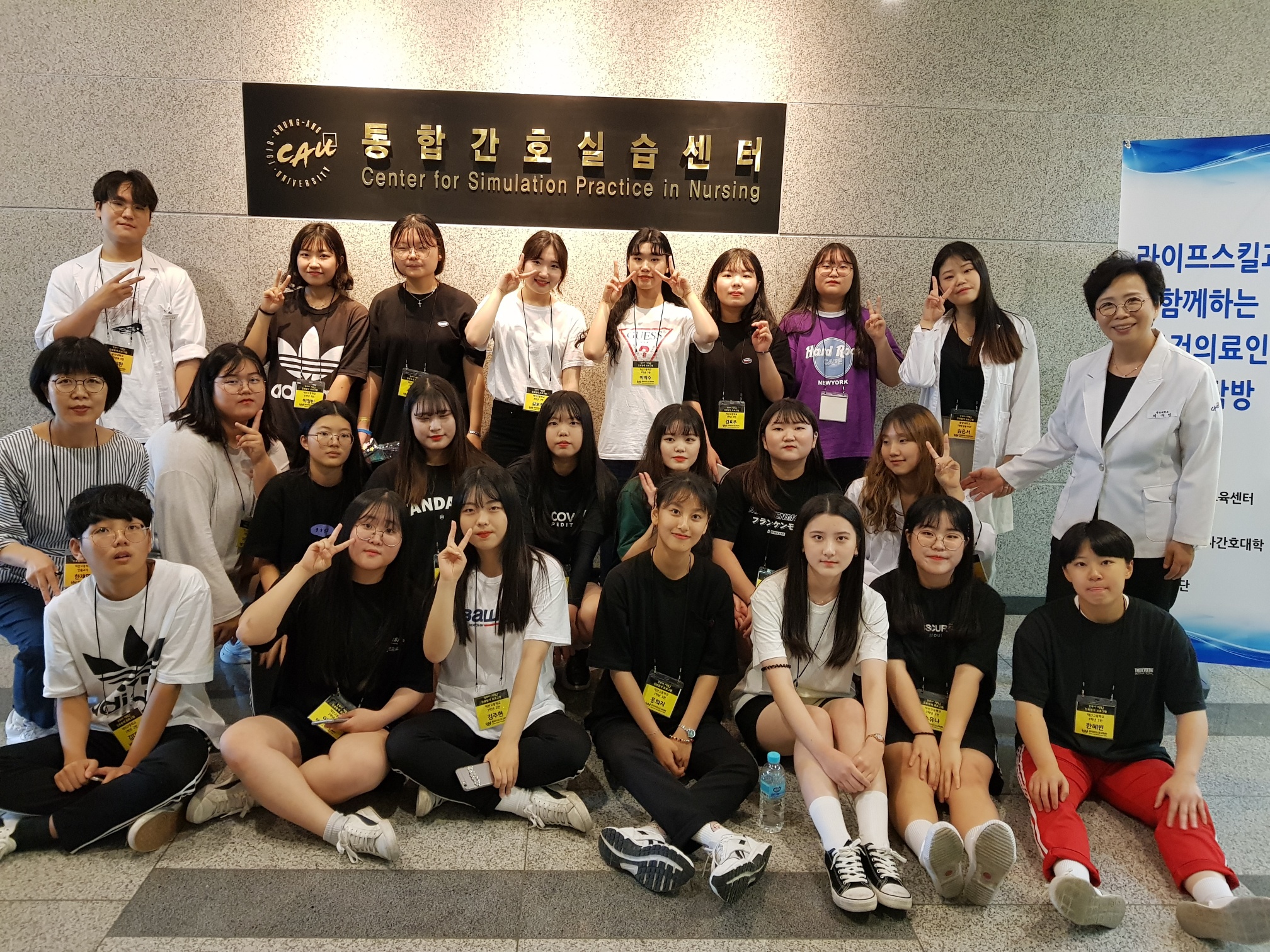 제목 : 라이프스킬과 함께하는 보건의료인 진로탐방 일시 : 2019. 7.15(월) 장소 : 중앙대학교 적십자 간호대학 통합실습실 (102관) 적십자간호대학 통합실습실에서 라이프스킬로 배우는 간호사 체험 프로그램에 참여하는 덕산고등학교 학생 (담당교사:한재영)들을 대상으로 ‘간호사 직업체험’을 실시함