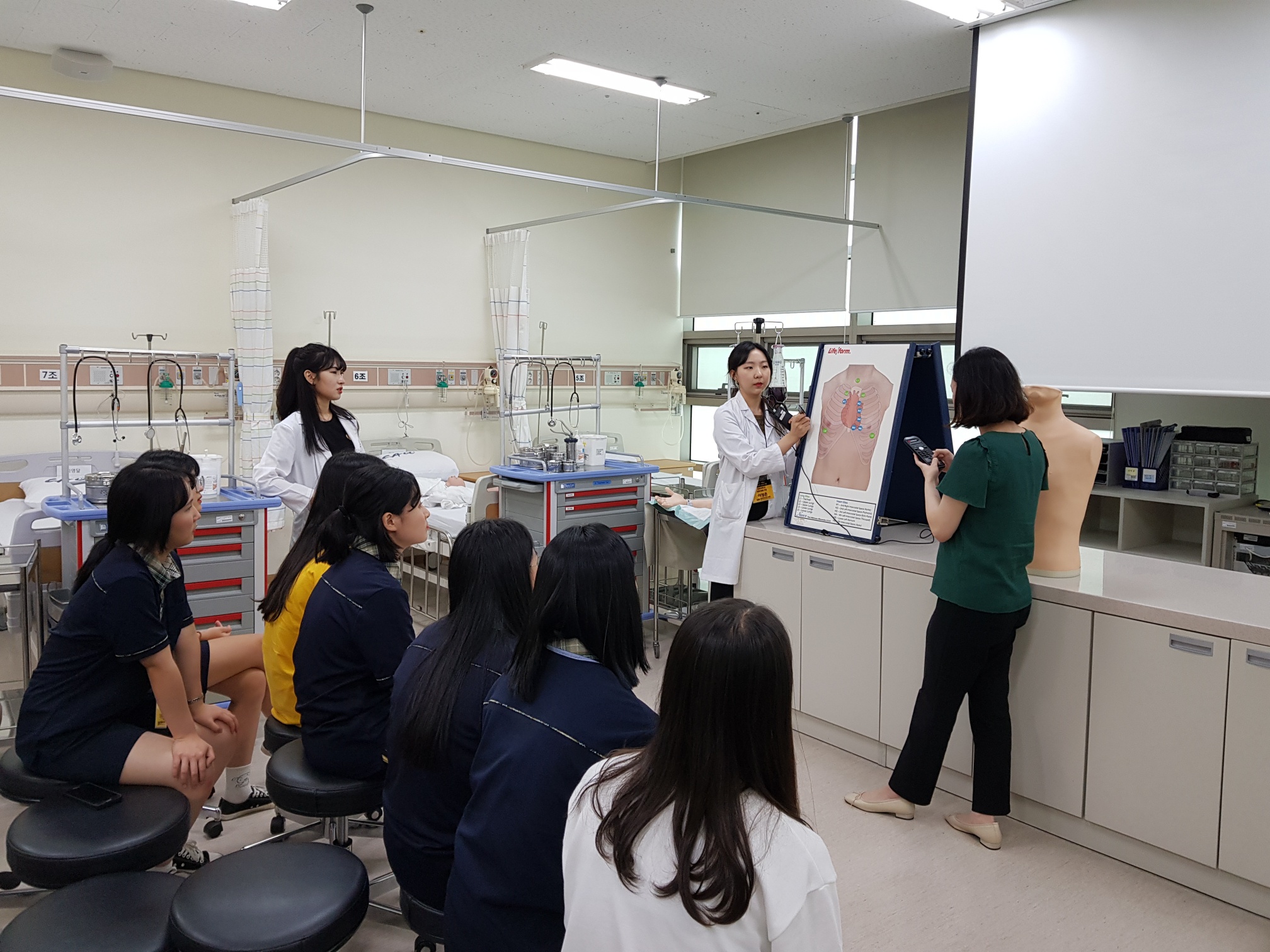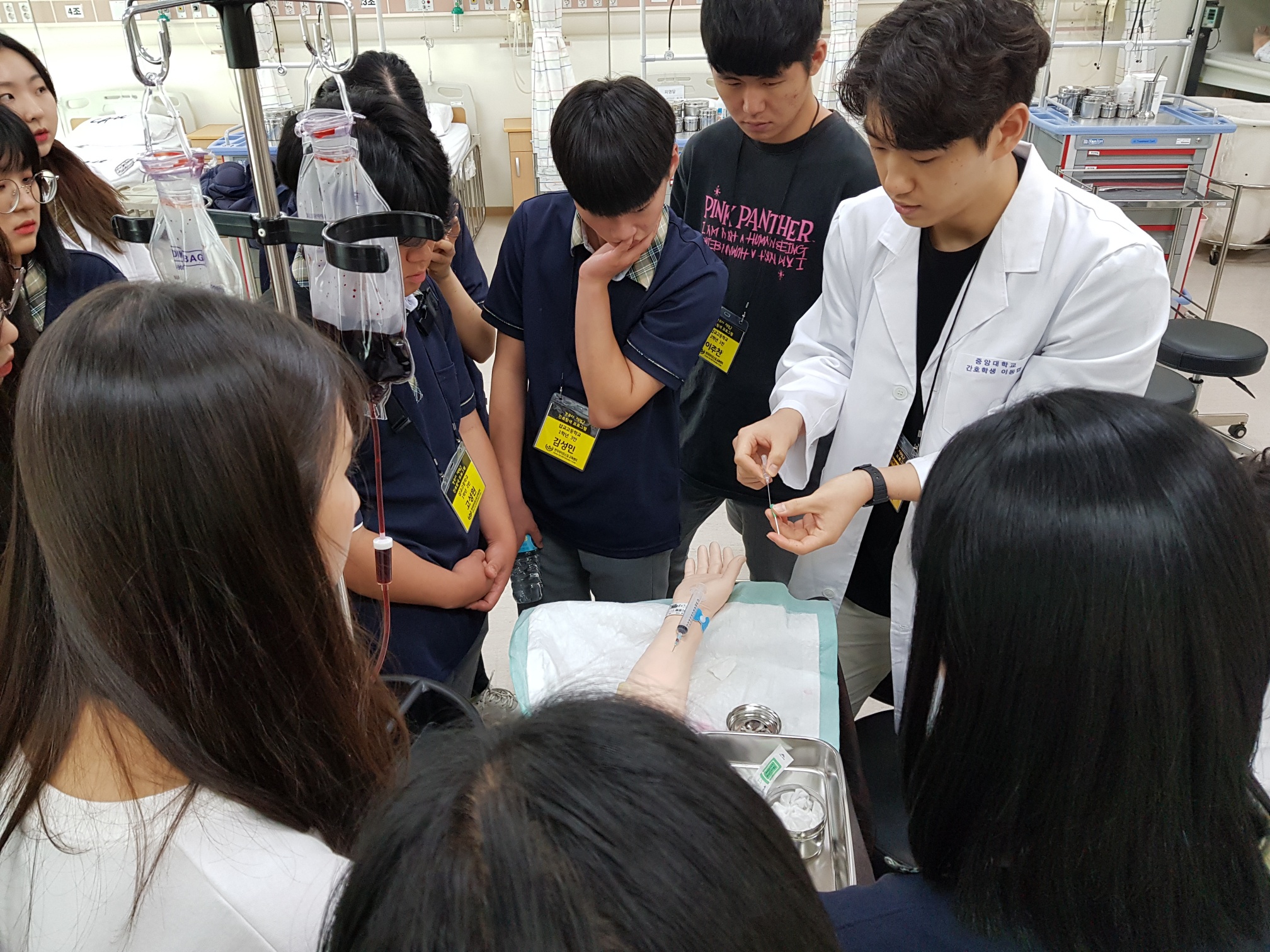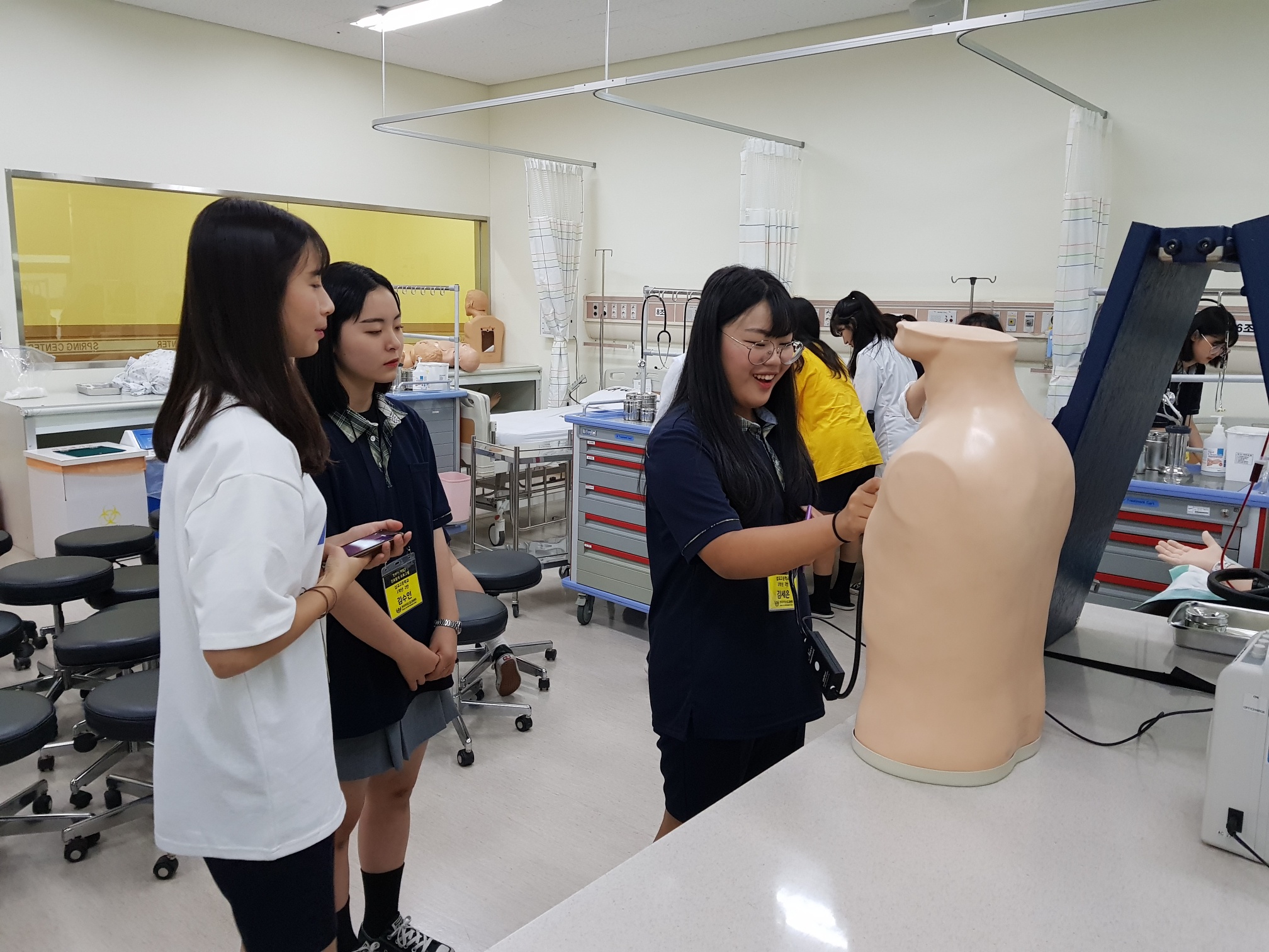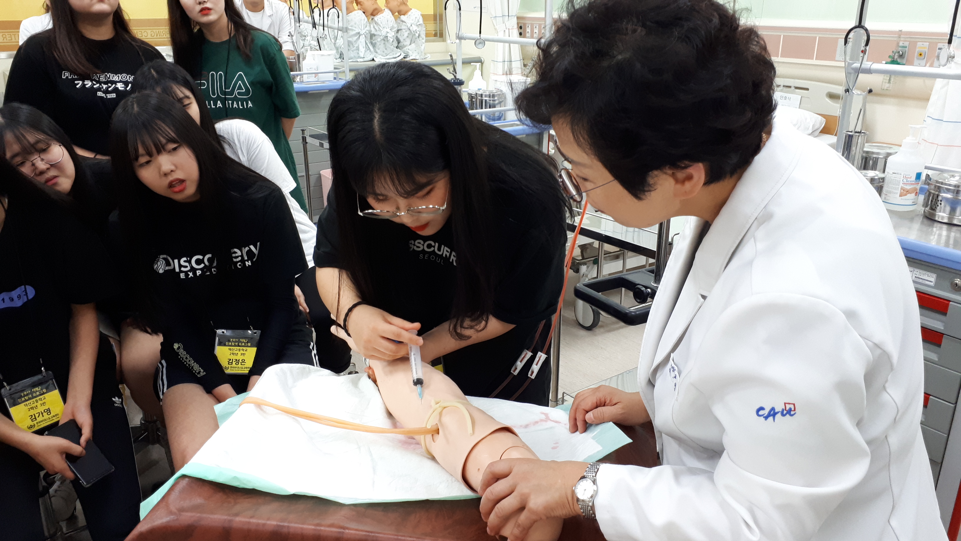 제목 : 라이프스킬과 함께하는 보건의료인 진로탐방 일시 : 2019. 7.15(월) 장소 : 중앙대학교 적십자 간호대학 통합실습실 (102관) 적십자간호대학 통합실습실에서 라이프스킬로 배우는 간호사 체험 프로그램에 참여하는 삽교고등학교 학생 (담당교사:이영숙)들을 대상으로 ‘간호사 직업체험’을 실시함