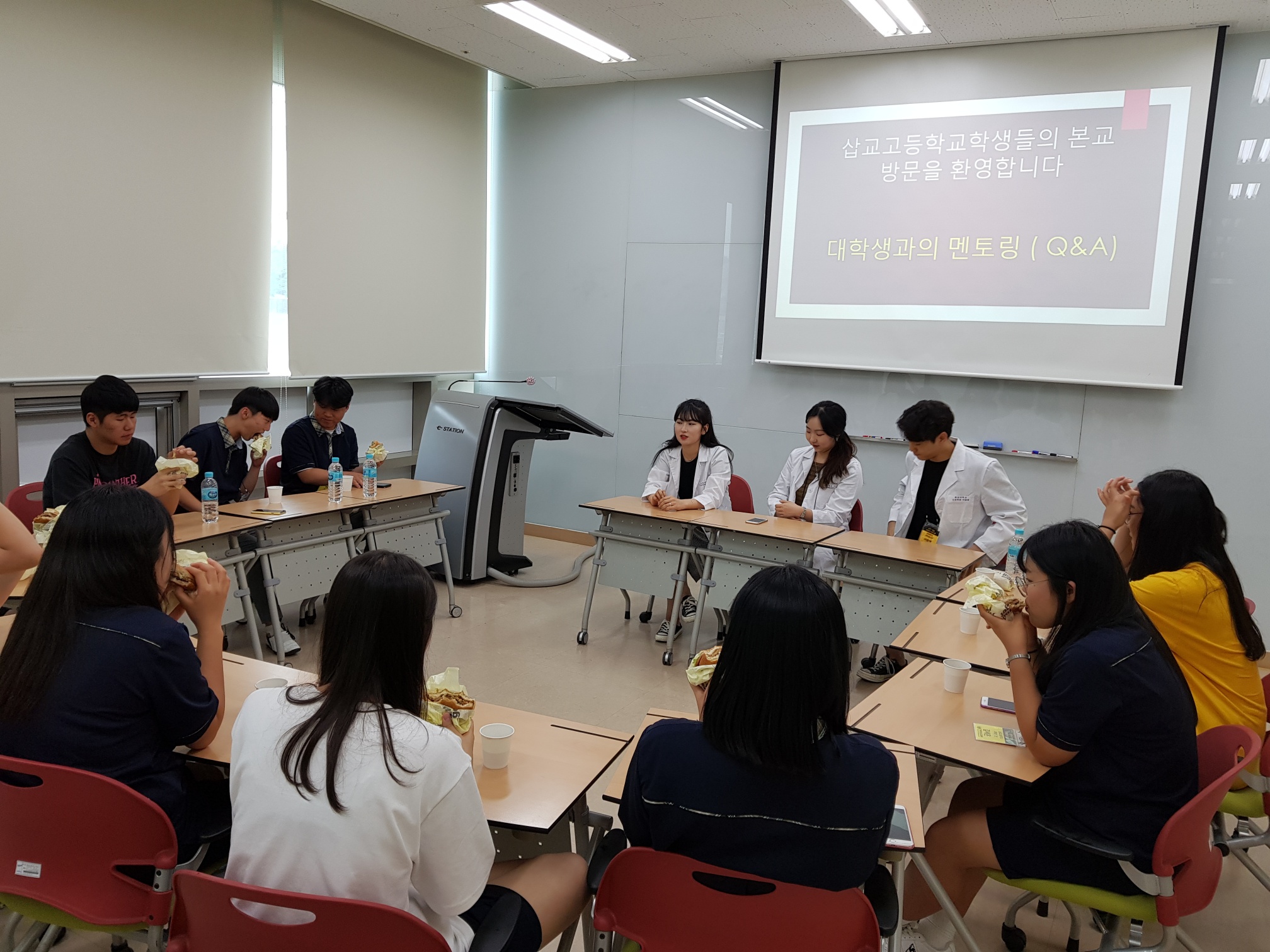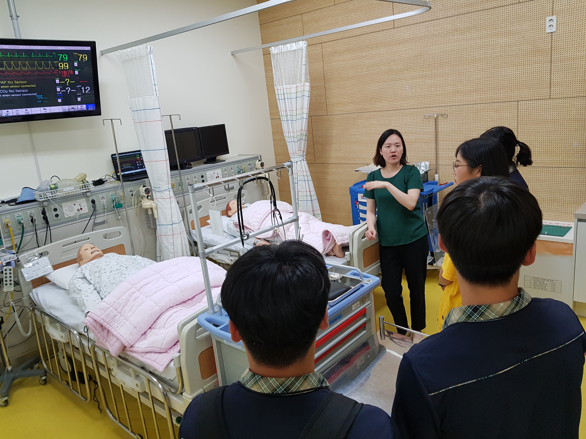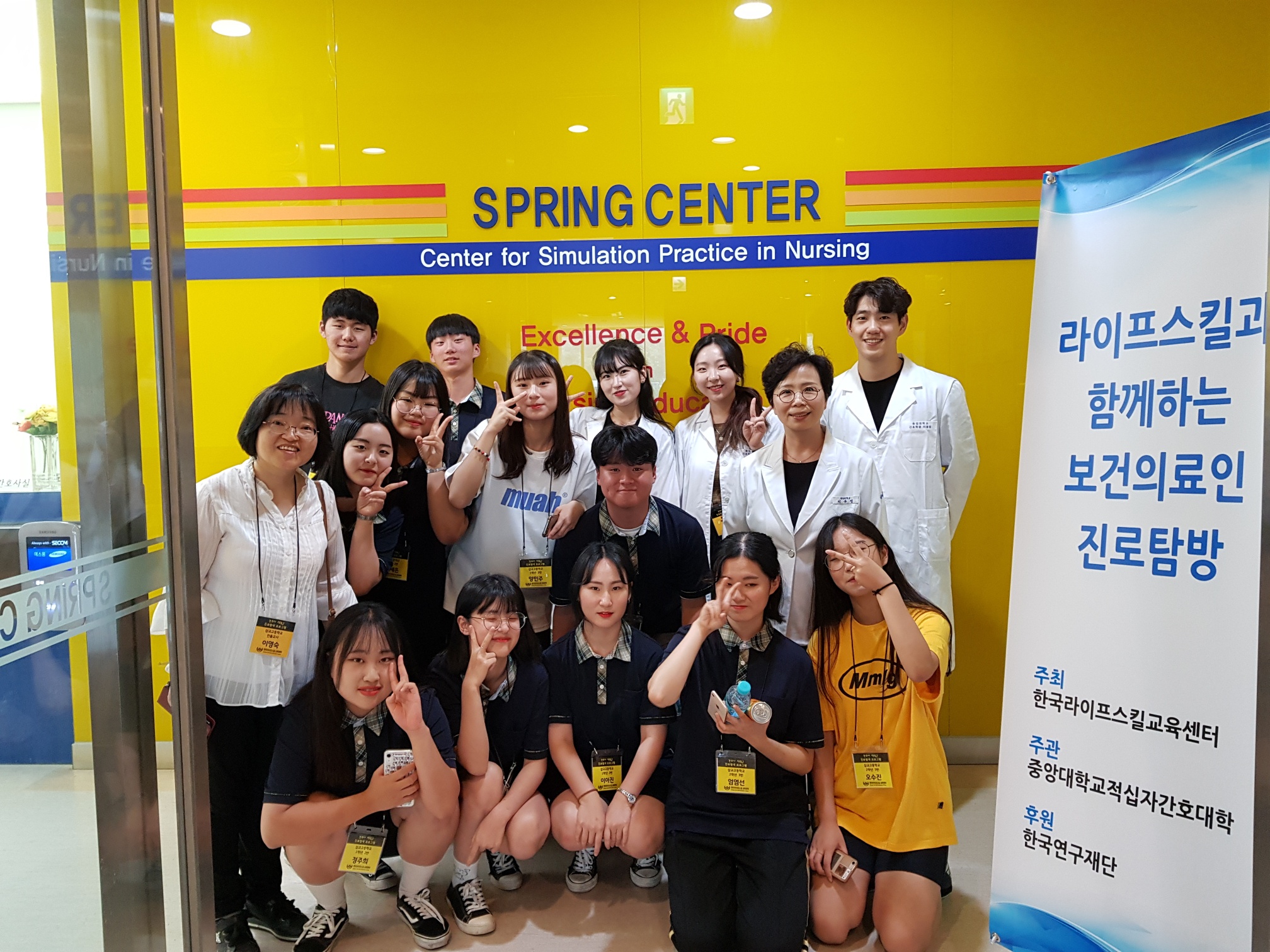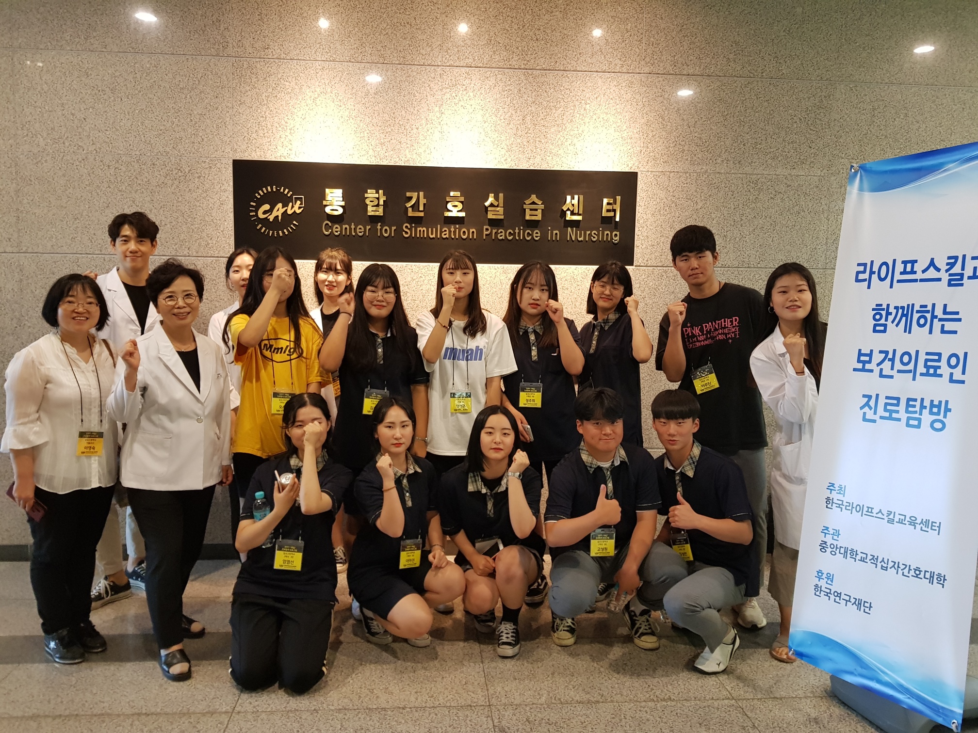 제목 : 라이프스킬과 함께하는 보건의료인 진로탐방 일시 : 2019. 7.15(월) 장소 : 중앙대학교 적십자 간호대학 통합실습실 (102관) 적십자간호대학 통합실습실에서 라이프스킬로 배우는 간호사 체험 프로그램에 참여하는 삽교고등학교 학생 (담당교사:이영숙)들을 대상으로 ‘간호사 직업체험’을 실시함