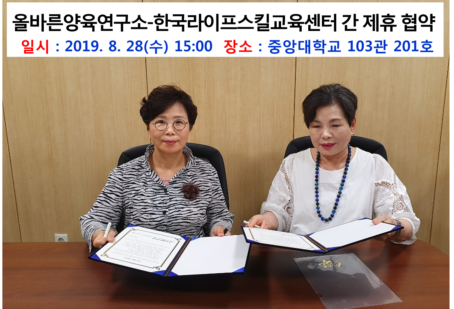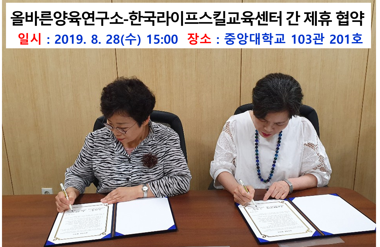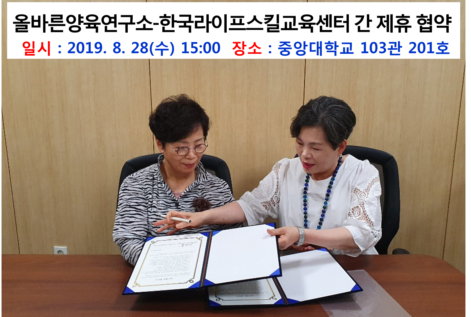 한국라이프스킬교육센터와 올바른 양육연구소가 MOU를 체결하였습니다 따라서 2019년 9월1일자로 양 긱환의 발전을 위한 공동사업을 개발하고 상호 활용하기로 하였습니다. 올바른 양육연구소 홈페이지: http://www.smartparenting.or.kr/